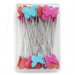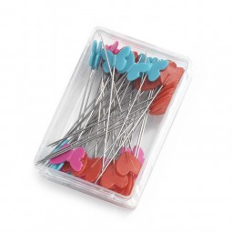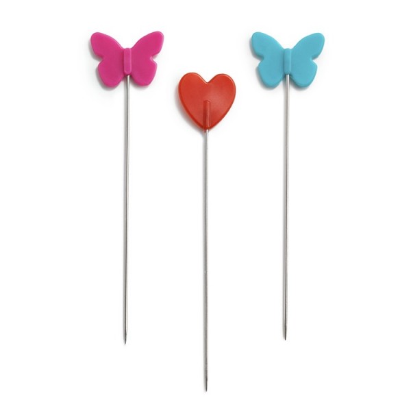 Longues épingles avec têtes en plastique plates en forme de cœur ou papillon. Grande stabilité de la jointure entre la tête et la tige. Pénétration facile du tissu grâce à la pointe fine.