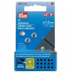 Plus la tige est longue, plus la matière à riveter (tel que le cuir) peut être épaisse. Les rivets tubulaires sont en laiton inoxydable de couleur argenté et donnent une apparence soignée par là où ils sont posés. Prym offre des rivets tubulaires qui peuvent être utilisés avec le Vario Creative Tool et le jeu d’outils approprié.