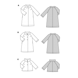 Cette pochette de 3 patrons permettra de réaliser des manteaux courts ou longs avec un détail de col effet chemisier.