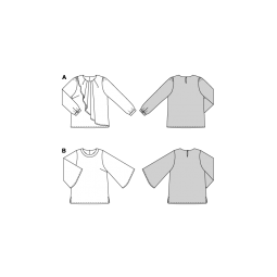 Cette pochette de 2 patrons vous permettra de réaliser des blouses à encolure ronde. Choisissez entre des manches resserrées ou évasées. Vous pouvez également ajouter un volant devant.