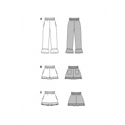 Cette pochette de trois patrons vous permettra de réaliser un pantalon avec volants en bas de jambes mais aussi deux shorts dans ce même esprit.