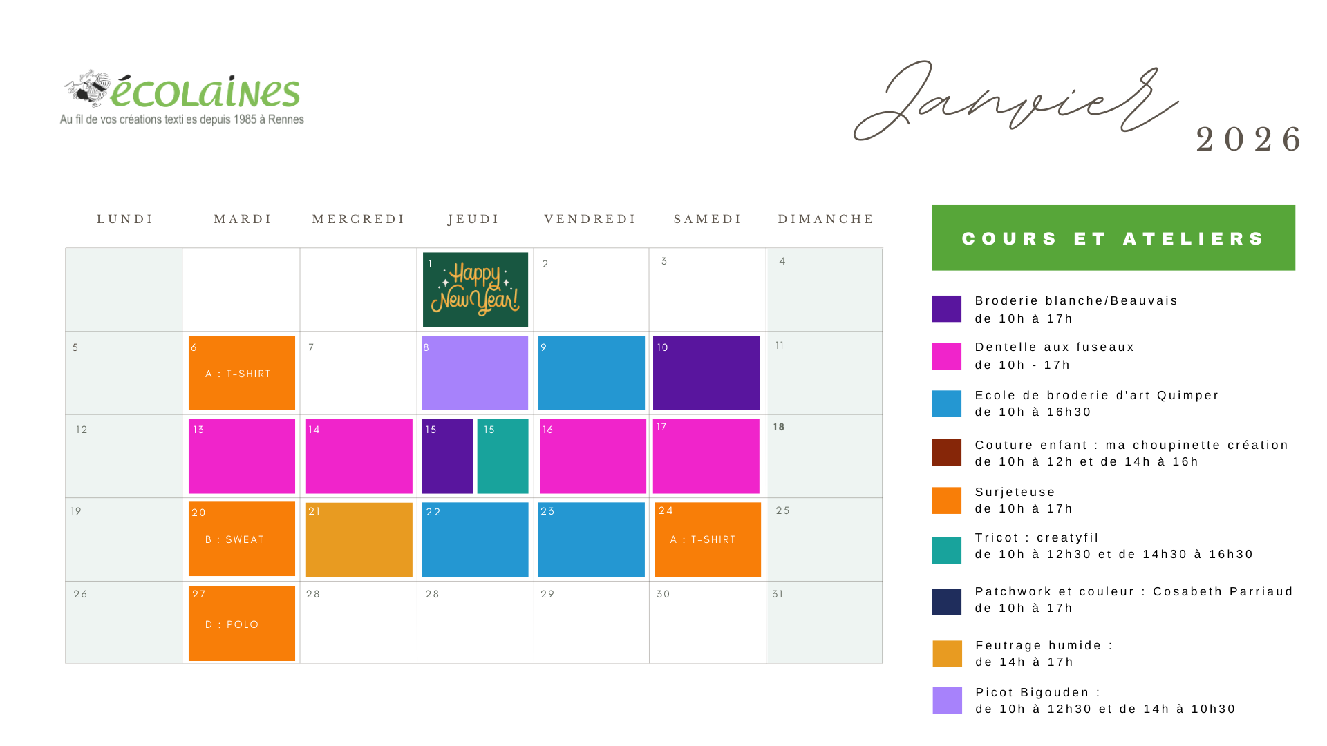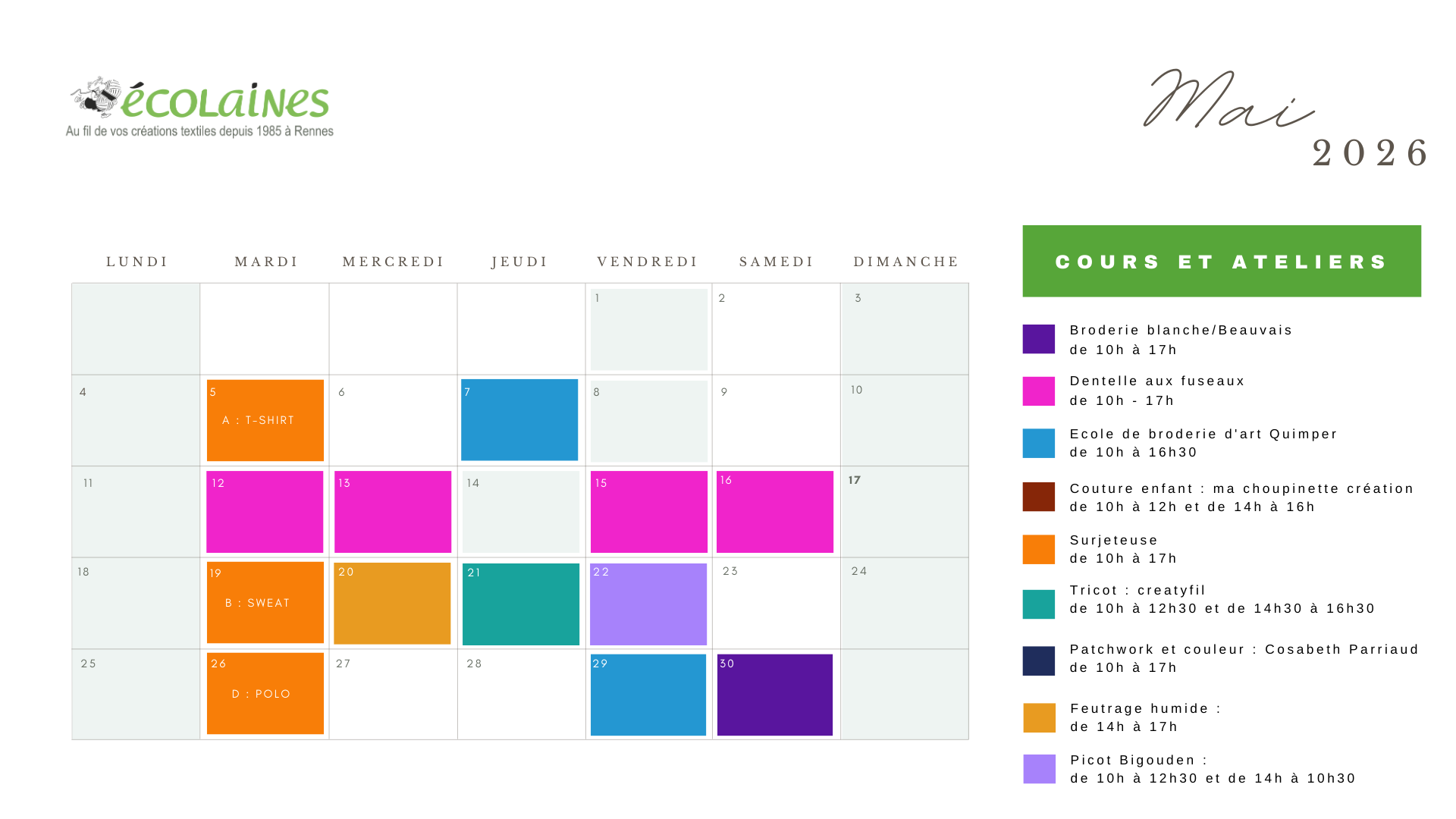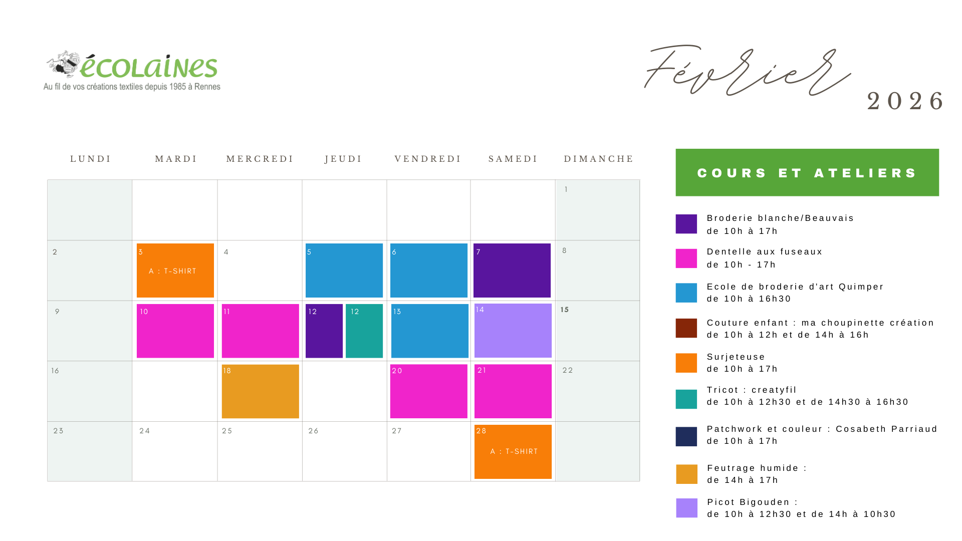 Nous vous proposons dans la mezzanine du magasin différents cours animés par des intervenants extérieurs : couture, tricot, broderie, dentelle…