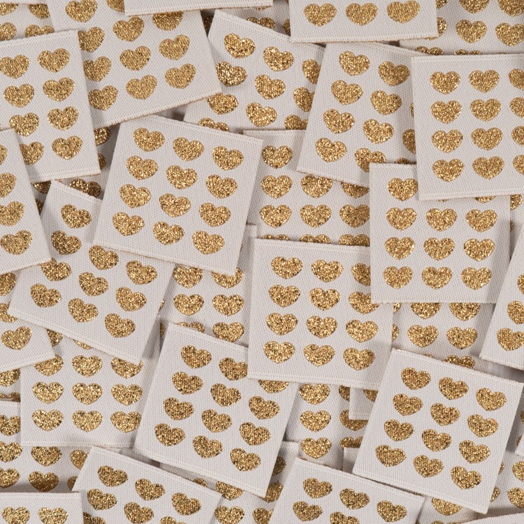Un lot de 5 étiquettes fond écru avec cœurs lurex doré tissées. Les étiquettes se posent avec un point de couture à réaliser sur le bord tout autour.