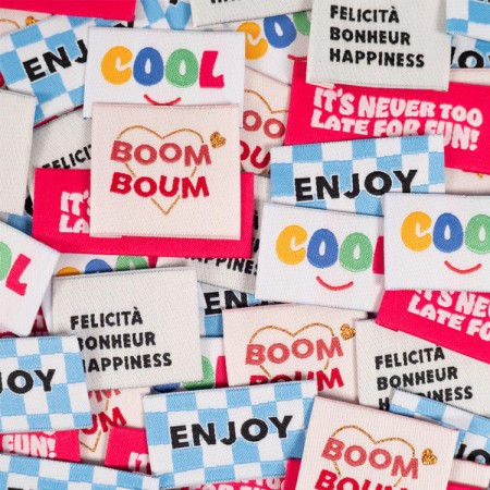Personnaliser vos créations, vos accessoires et vos vêtements avec les étiquettes de la célèbre marque de patron Ikatee Un bel assortiment de 4 étiquettes différentes. Les étiquettes se posent avec un point de couture à réaliser sur le bord tout autour.