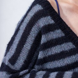 Un modèle de tricot de la marque Plassard. Le gilet se tricote à plat avec coutures d'assemblage. Il se caractérise par des rayures sur l'ensemble du corps. Il a une forme oversize avec un col V et un boutonnage à l'avant.
