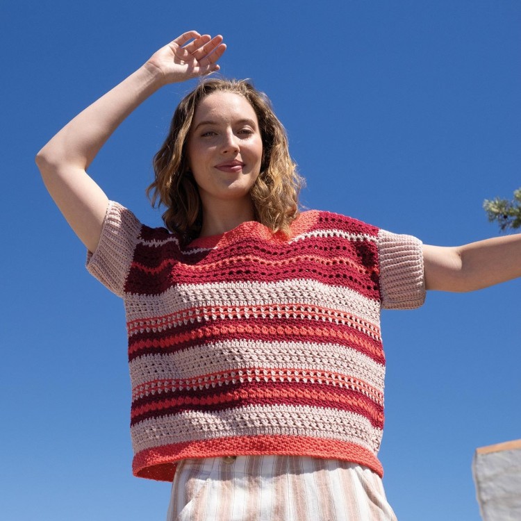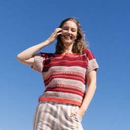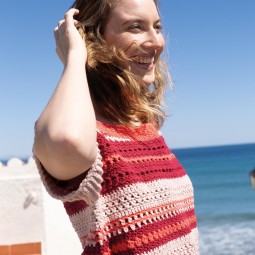 Un modèle de crochet à réaliser avec le fil Alabama de Katia. Le top se caractérise par des rayures irrégulières sur le corps et est réalisé avec différents point fantaisie expliqués dans le catalogue.