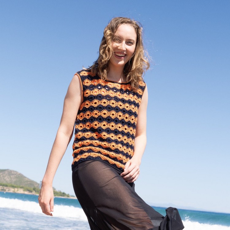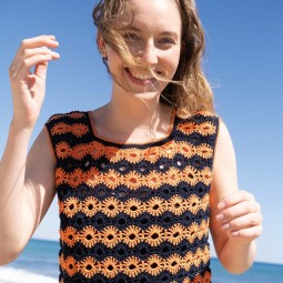 Un modèle à réaliser avec le fil Tencel-cotton de Katia. Le modèle se caractérise par un col rond et des bretelles larges. Un motif de fleurs effet rayures se dessine tout le long du corps.
