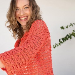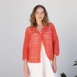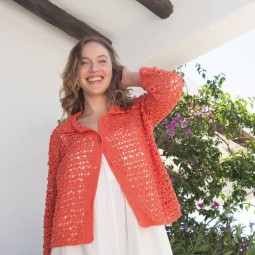 Réalisez un modèle original pour la saison chaude en fil fair cotton de Katia. Le gilet se caractérise par un point ajouré sur l'ensemble du projet. Un col façon chemise et une ouverture par boutons en font un modèle original.
