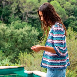 Réalisez un modèle original pour la saison chaude en fil fair cotton de Katia. Le gilet est travaillé avec des rayures tout le long du corps.