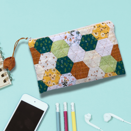 Travaillez le patchwork à partir de gabarits pour réaliser une suite d'hexagones afin de former une trousse pratique à emporter partout. Le kit comprend tout le nécessaire pour réaliser la trousse.