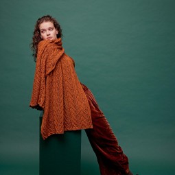 Kit de laine à tricoter à partir du fil Nomad de la marque Lang Yarns. L'étole est large et entièrement ajourée.