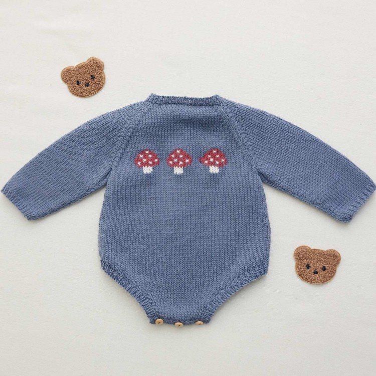 Un modèle de tricot à réaliser avec le fil Merino baby de Katia. Le modèle se caractérise par des boutons au niveau de l'entrejambe et des manches longues. Des champignons sont brodés.