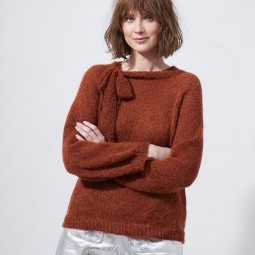 Un modèle de tricot de la marque Plassard. Le pull se tricote en rond et comporte un nœud à l'encolure.