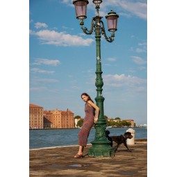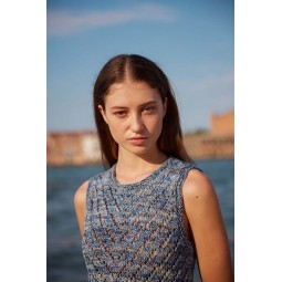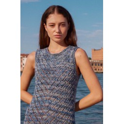 Un modèle de tricot à réaliser avec le fil Footprints de Wooladdicts par Lang Yarns. Une robe longue et sans manches avec des motifs ajourés tout le long de la robe. Elle se tricote en rond.