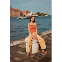 Un modèle de tricot à réaliser avec le fil Footprints de Wooladdicts par Lang Yarns. Un top à fines bretelles à tricoter en rond.