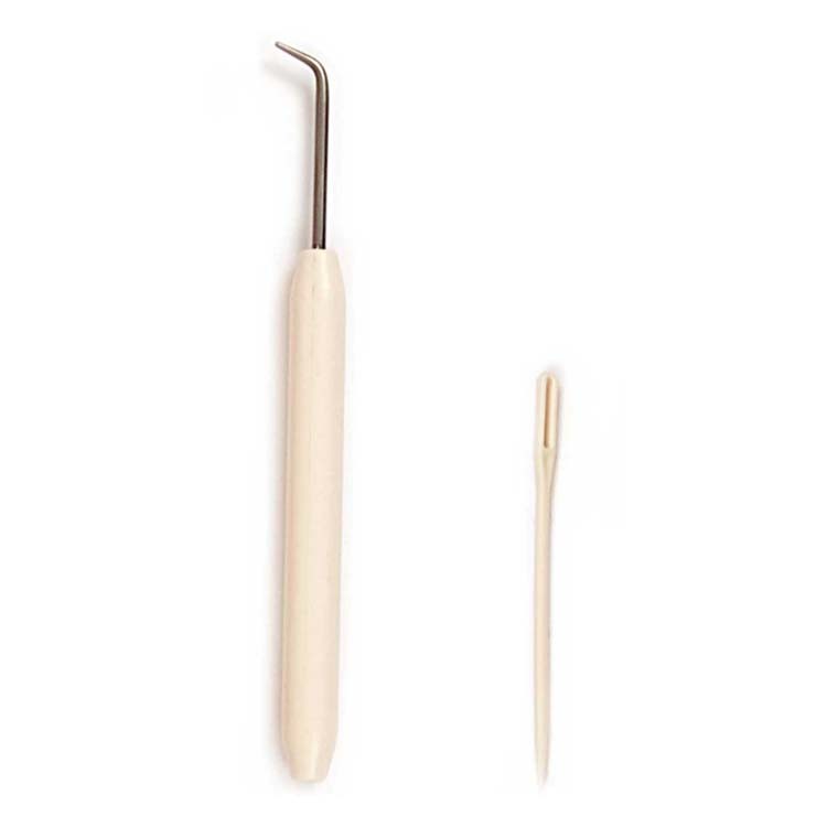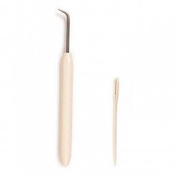 Grâce à sa forme spécifique, le crochet permet d'attraper facilement les fils sur les tricotins.