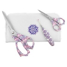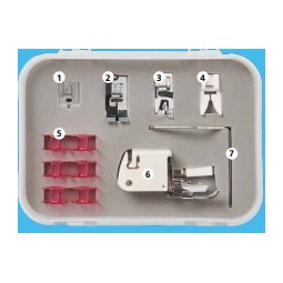 En cadeau : le coffret d'accessoires, avec pied téflon, pied double entrainement, pied ourleur, pied fermeture invisible, pied pour bordure, guide droit, 6 canettes, ciseaux et coupe fil au design exclusif