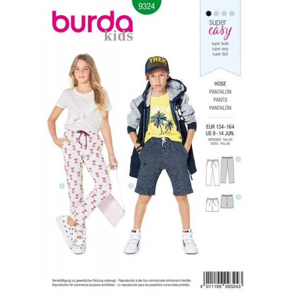 Faciles et vite cousus, le pantalon et le short décontractés, avec des poches en biais et une ceinture à coulisse élastique conviennent aux filles et aux garçons. La fermeture à glissière est factice.