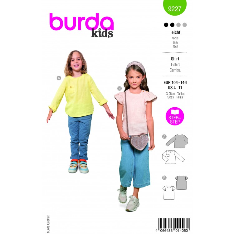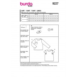 Pochette de 2 patrons pour réaliser un t-shirt à manches longues et col rond ou une version à manches volantées. Les deux ont une patte de boutonnage à l'épaule.