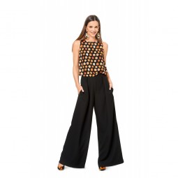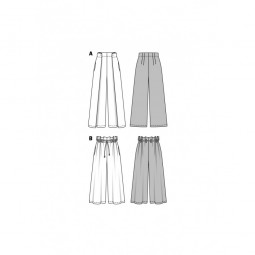L'ampleur du bord supérieur du pantalon est résorbée par des plis fixés avec des boutons-pression pour la variante A, et par un cordon noué autour de la taille pour la variante B.