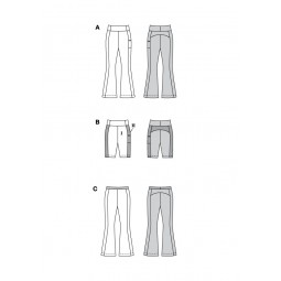 Pochette de 3 patrons pour réaliser un pantalon ou un short. Choisissez une coupe longue et évasée avec bande contrastante ou non au niveau de la taille. Un cycliste avec bandes contrastantes.