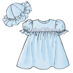 Créez plusieurs ensembles pour bébé grâce à ce patron Butterick : Robe combinaison avec corsage ajusté, taille haute, fermeture à bouton au dos. Jupe ample et froncée. Pantalon ample, bouton-pression à l'entre-jambe et élastique aux jambes. Tous ont des courtes manches avec élastique. Culotte avec élastique à la taille et aux jambes.