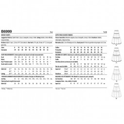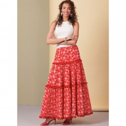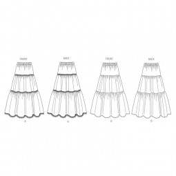 Patron Butterick pour coudre une jupe à volants amples et doublées avec une taille élastique. La vue A a une bordure à pompons.