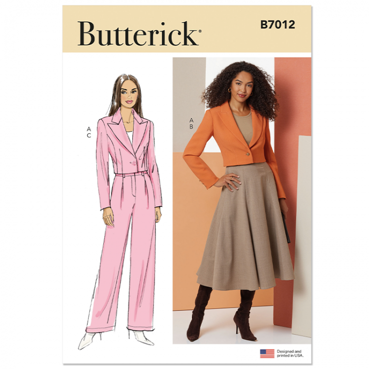 Butterick vous propose avec ce patron de confectionner un ensemble composé d'une veste et d'une jupe midi ou d'un pantalon large à pinces sur le devant