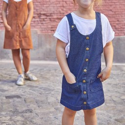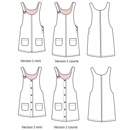 2 longueurs : robe courte au-dessus des genoux, ou mini (sous-fesses) Dos identique pour les 2 formes. Finitions avec enformes devant et dos. Une bretelle ouvrable. Poches plaquées en option. Emmanchures et encolure profondes. À porter en superposition sur un tee-shirt, sous-pull ou une blouse. Robe adaptée à toutes les saisons.