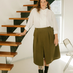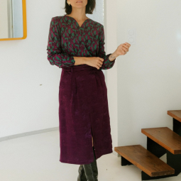 La jupe Silvana joue avec les codes du vestiaire masculin et réinterprète de manière audacieuse et ultra féminine le pantalon de tailleur : coupe légèrement évasée et longueur midi intemporelle et facile à adopter, haute fente frontale pour l’aisance et l’allure, poches italiennes et ceinture fine avec des passants pour une élégance assumée. Le dos est fermé par un zip invisible et appuyé par des pinces pour un tombé parfait.