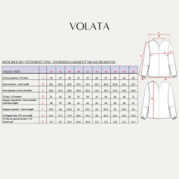 Il y a de la poésie dans l’air... La blouse VOLATA séduit par sa ligne épurée qui échappe à la rigueur grâce la délicatesse de son encolure en aile d’hirondelle devant et dos. Sa ligne est souple et droite, aussi élégante que confortable. Très chic en uni, elle ravira les amoureuses d’imprimés par sa construction simple qui laisse s’exprimer les motifs et se déclinera au fil des saisons et des envies. Le Patron Volata grade du 34 au 52.