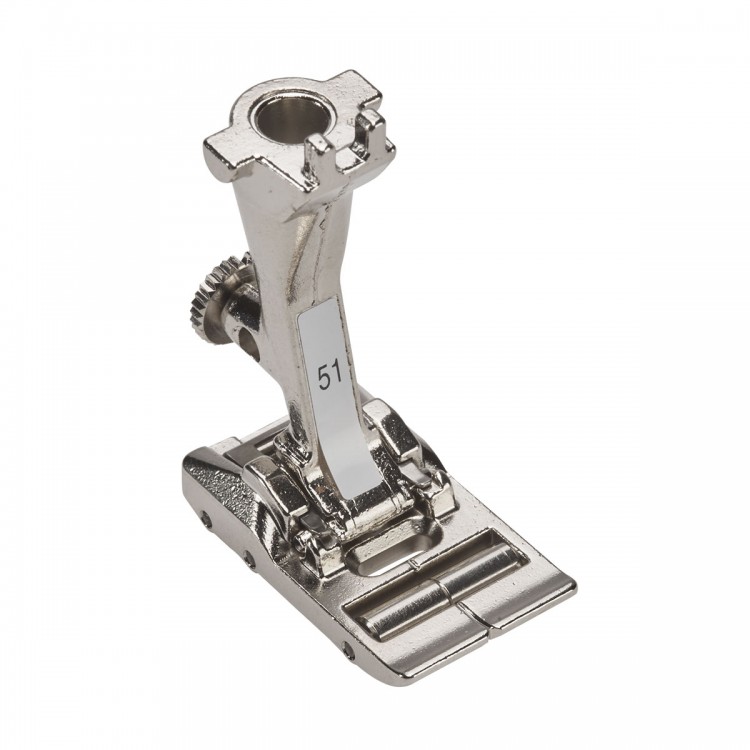 Pied sur roulettes 51 est le pied spécifiquement conçu pour coudre des matériaux difficiles. Les trois roulettes placées sous le pied lui permette d'avancer facilement sur des tissus collants comme le cuir ou le vinyle ainsi que sur les tissus dont la surface est fortement structurée