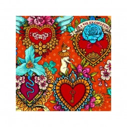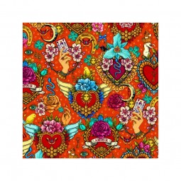 Un tissu porte-bonheur ! Voilà ce que j’ai imaginé pour ce dessin qui rassemble toutes ces amulettes populaires. Vous y retrouverez pêle-mêle : trèfle à 4 feuilles, fer à cheval, clé du bonheur, chat noir, cœurs ardents, cartes d’oracle et autres gri-gri… Le style « tatouage rétro » apporte à ce tissu une délicieuse touche vintage et décalée.