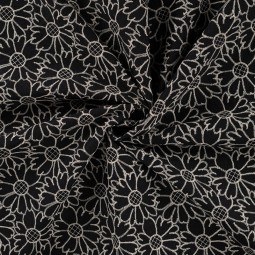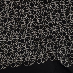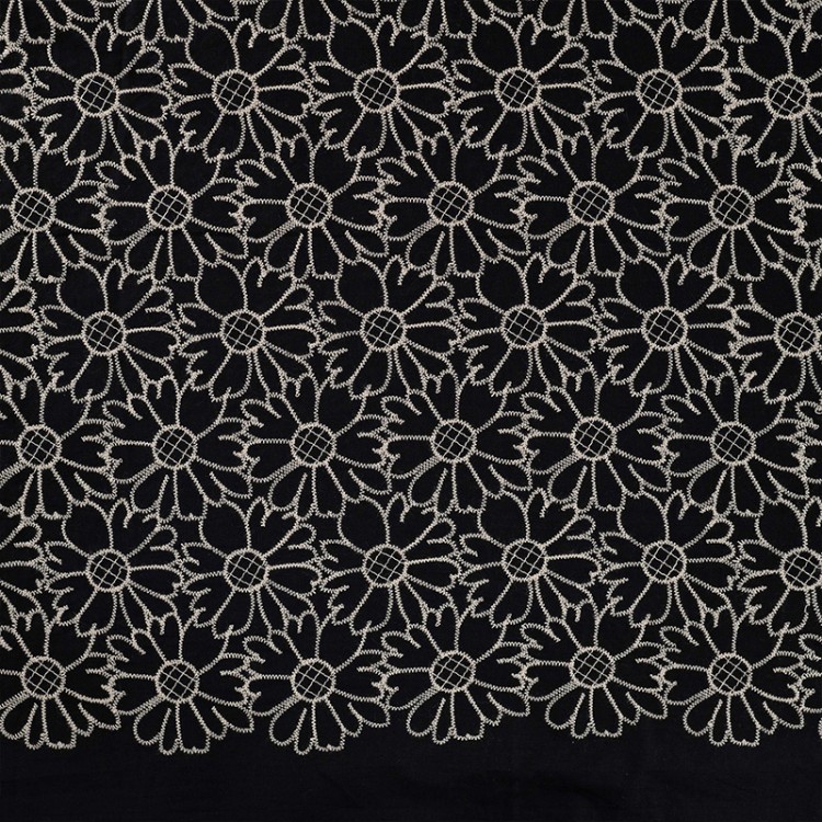 Tissu noir 100% coton en broderie anglaise composé de broderie de fleurs blanche.