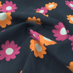 Velours côtelé façon rayures milleraies fines légèrement extensible très apprécié pour son confort. C'est un tissu doux avec un léger relief de côtes avec motif imprimé.
