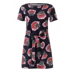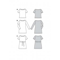Indispensable dans toutes les armoires, un tee-shirt ajusté à encolure bateau et manches courtes. Pour les versions B et C, il se transforme en tee-shirt long et minirobe. Une ceinture à nouer accessoirise la taille et déjà la robe est fin prête pour sortir.