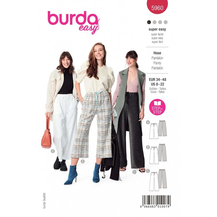 Vite et facile à coudre, ce pantalon ultra pratique avec des jambes de coupe droite offre tout ce dont un pantalon a vraiment besoin : une coulisse élastiquée à la taille agrémentée devant d'un joli nœud et de poches invisibles prises dans les coutures. Autre atout, on peut varier la longueur des jambes à volonté.