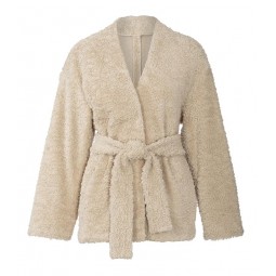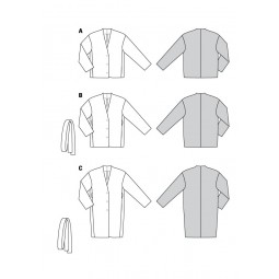 Deux vestes et un manteau décontractés qui offrent de multiples combinaisons. Dépourvus de col mais avec une petite encolure en V, des épaules débordantes, des coutures de découpe et des poches prises dans les coutures.